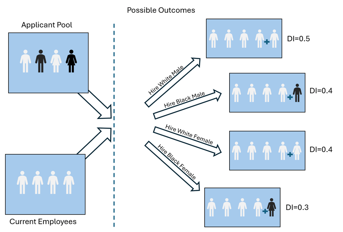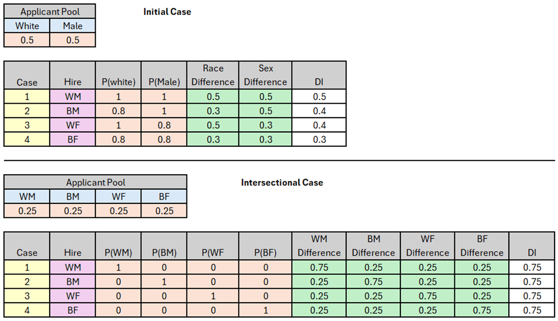 3) Hiring the black female applicant only minimizes the dissimilarity index because of how we’ve described the employee characteristics of race and sex. We could have described race & sex with more categories without changing anything about the underlying details. We could have identified black females and black males as entirely different types of people. Indeed, intersectionality implies exactly that there are interaction effects among characteristics that are not merely the sum of the individual characteristic effects. This is why peoples say things like “as a black female” or “as a white male”. They are identifying their particular combination of race and gender effects.