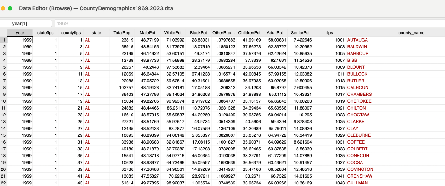 I cleaned and reformatted the CDC SEER data into a neat panel of county demographics that look like this: