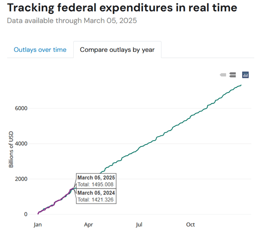 One way to evaluate spending is to compare the cumulative spending over the course of 2024 and 2025. That is, spending on the 45th day of the year should be more or less comparable in 2024 vs 2025. It’s still early in the year and since various payments can be quite irregular, there’s a lot of noise in the data so far. But we should be able to see big changes. Smaller changes will be easier to see as the year goes on.