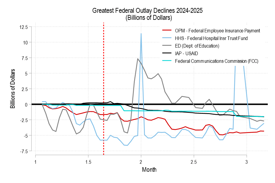 While big percent changes in outlays can have massive implications for individual programs, Musk and Trump will need to cut huge amounts in order to claim any kind of victory over profligate spending. (Just so we’re all on the same page, they will fail if they refuse to touch old-age entitlements.) Where have the biggest spending cuts happened as measured by actually dollars? See below.*** The deepest and most consistent cuts are coming from the reductions in federal employee insurance payments. Similarly, the USAID and FCC cuts amount to a $2 billion cut from this time last year. Department of Education spending and the hospital insurance trust fund are down, but are also more volatile in their expenditures. Those one-time spikes in the data are due to pay dates between 2024 and 2025 being offset by a day or two.