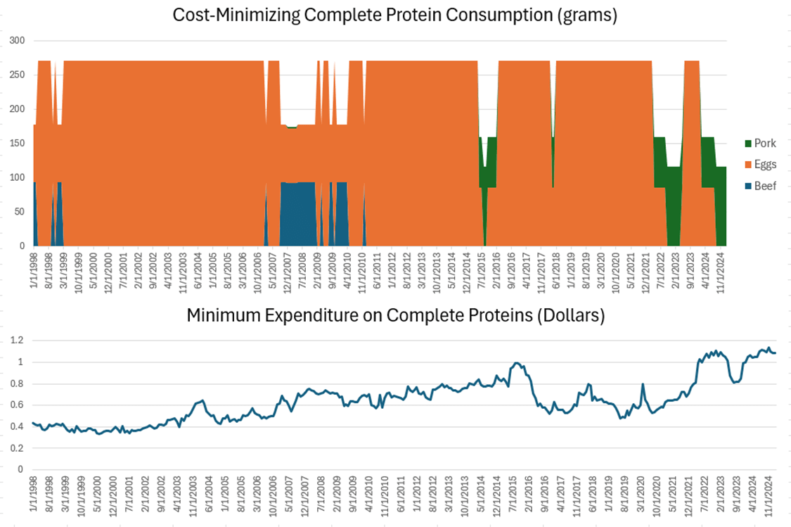 In fact, we have the price of these protein sources going back almost every month to 1998. While pork is exceptionally nutritious, it hasn’t always been most cost effective. Below are the prices for 1998-2025. See how the optimal consumption bundle has changed over time – after the jump.