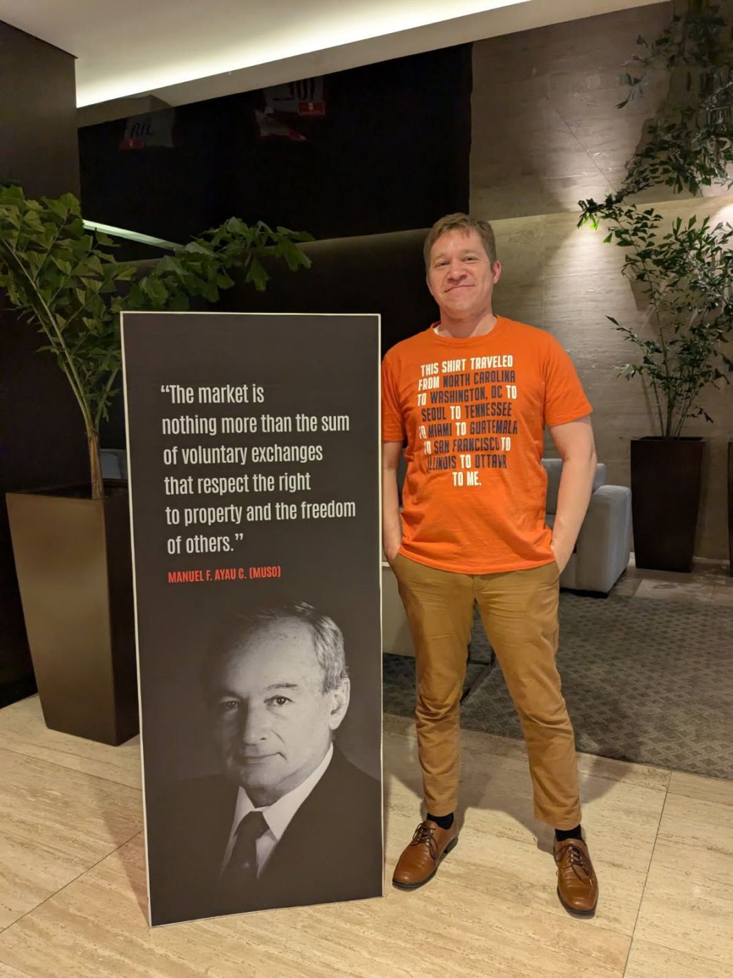 - Cato’s “I, T-Shirt” — the title is an obvious nod to “I, Pencil,” taking a similar approach to making a t-shirt as Planet Money, but with more of an emphasis on globalization and the importance of international trade. Although the shirt says “made in Guatemala,” it is actually the product of global cooperation (much of the value-added being in the US). I was fortunate enough to obtain this t-shirt as well, and even brought it back to Guatemala this week to visit its place of “birth” and take a few photos (at Universidad Francisco Marroquín):