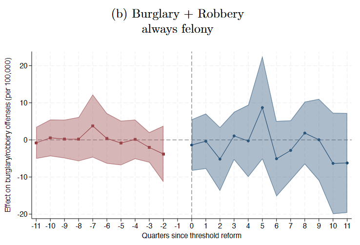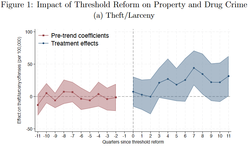 In the quarters leading up to a threshold change (above) we see flat pre-trend with a coefficient of zero i.e. nothing happening. Nothing happening is good, it means that neither law enforcement nor criminals exhibit any sign of anticipating the change. Once a given state makes the change, we see an uptick in rates of theft within 6 months that persists for three years. Speculating beyond that is dangerous – too many other things happening in the world. But criminals seem to be responding.