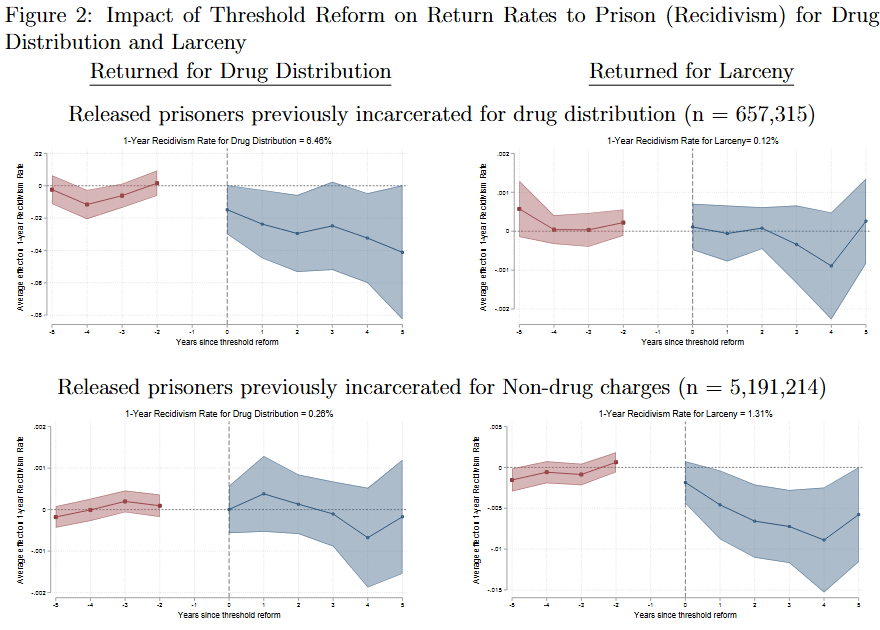 This is where recidivism comes in. Using detailed, restricted-access, prisoner records, we track when prisoners are released and if/when they are returned to prison. By stratifying the analysis by the crime types they were previously incarcerated for, we can separately estimate the effects of felony threshold changes on individuals with human and social capital in the drug distribution business from those who do not. What we observed is both striking and subtle.