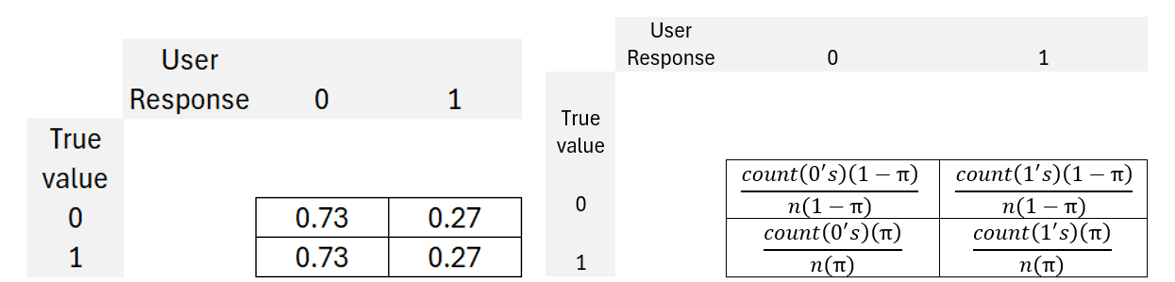 Let’s address the first issue. The DS method adopts a prior of a 50-50 split between 1’s & 0’s absent other information. It turns out that this prior doesn’t matter much. The further the prior is from the truth simply increases how much information we need in order to solve our problem. For our current example, let’s adopt a prior that there are 20 of the 100 images including the word “pass”, or π =20%. Given the difficulty of the problem, it stands to reason that incorrect designations are possible. As a starting point, we can expect that a user will answer with a 1 for 20% of responses. Therefore, without any bias in how a user makes mistakes, we would expect the below matrix. Notice that the possible user responses sum to 1 under each true value. This is called a confusion matrix and it describes a user’s correct and incorrect designations. It’s a 2×2 matrix because it includes two possible responses and two possible true states of the world.