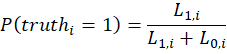 Once we have a confusion matrix for each person, we can calculate the likelihood of seeing the actual user responses under the assumption that the true label is 1 for an individual image. We can do the same assuming that the true label is 0.