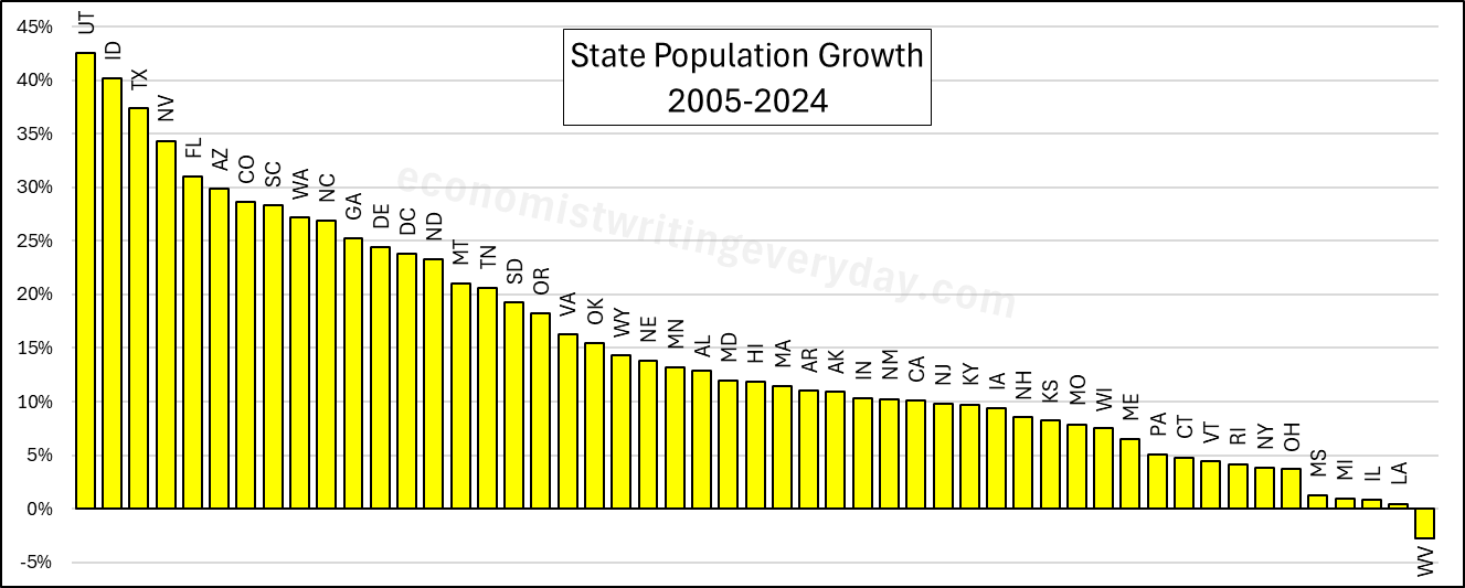 In the interest of being comprehensive, this post includes basic growth stats for all states from 2005 through 2024 (the years of FRED-state GDP).** First, let’s start with the basic building blocks of population, employment, and RGDP. Institutions matter. Policy affects whether people migrate to/from the state, fertility, how many people are employed, and what they can produce.