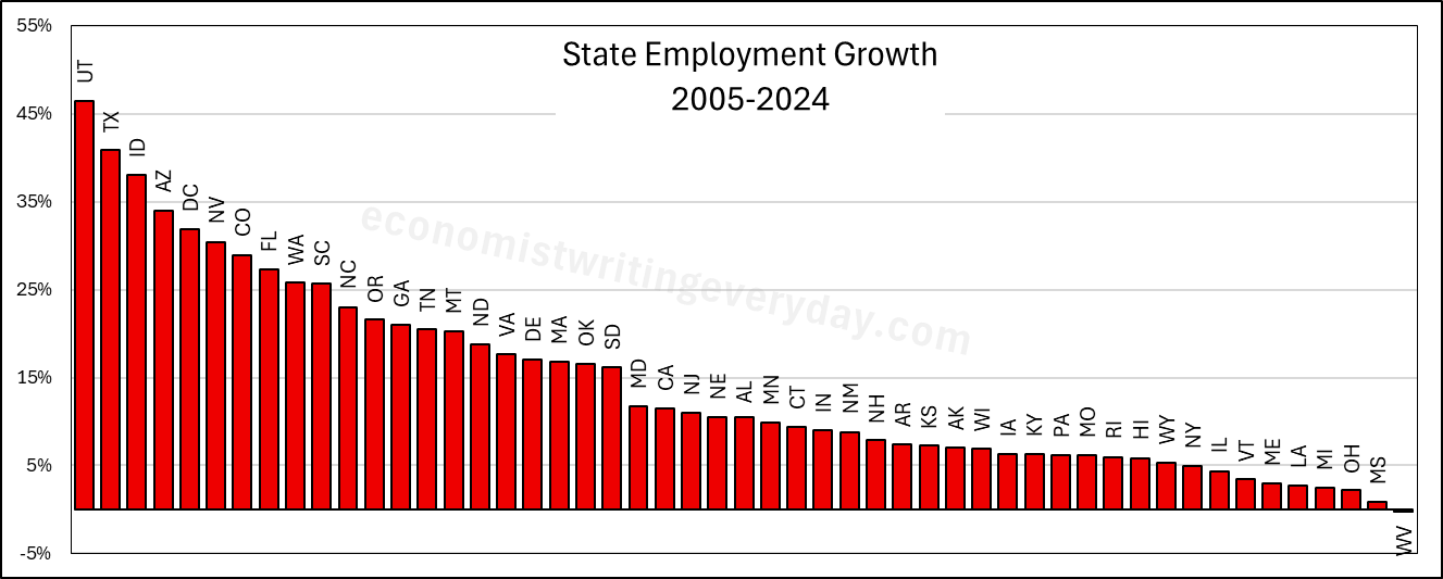 People like to talk about migration and the flocking to Texas & Florida. But that fails to catch the people who choose to stay in their state. Utah is 43% more populous than it was 20 years ago. But you don’t hear much clamoring for their state policies. Idaho and Nevada also beat Florida in terms of percent change. Where are the calls to be like Idaho? Employment largely tracks population, though not perfectly. The RGDP numbers can change quickly with commodity prices, reflected in the performance of North Dakota. But remember, these numbers cover a 20 year span. So, any one blockbuster or dower year won’t move the rankings much.