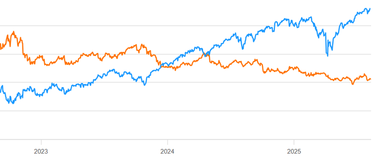 For whatever reason, normal trend-following MF has been a bad business for the past 2 years. Here is a continuation of the chart above, showing mid Aug 2023- mid Aug 2025 for KMLM (orange line) compared to S&P 500 stocks (blue line):