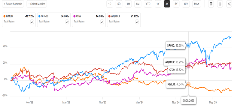 There are fundamental reasons why those two funds would behave differently than plain vanilla trend-following KMLM. CTA adds a factor called carry (which I will not try to define) to its algo, and also takes large concentrated bets. AQMNX draws on the very sophisticated quantitative resources of the AQM fund family. It also takes long/short bets on equities (e.g. S&P 500 index), which are not in KMLM. AQMNX is not available through all brokerages (it is at Fidelity).