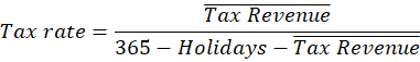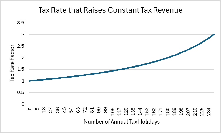 Given constant annual revenue, what’s the impact of a tax holiday on the otherwise standard sales tax rate? With the law of demand in hand* and no intertemporal substitution or avoidance, let’s see the relationship between the number of days of tax holiday and the amount by which the tax rate on the non-holidays must change. As the number of tax holidays increases, the tax rate on the remaining days must go up, and must increase more with each additional day of zero sales tax. The tax rate would be double in the presence of 179 tax holidays and triple if we have 239. That means a that rather than facing a 6% sales tax, one would face 12% and 18% respectively. I’ve truncated the graph x-axis because it peaks at day 357 at a factor of 424, after which one can’t collect the same revenue at any tax rate.
