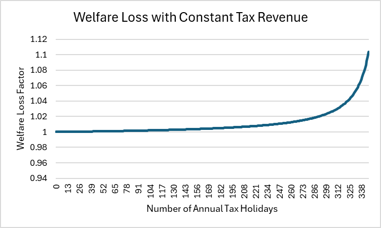 What about the consumer welfare? Because demand slopes down, the value placed on the greater consumption during a tax holiday is smaller than the value of the units forgone due to the higher taxes borne on the taxed days. This is why lost welfare increases fast as the tax rate rises. With each incrementally higher tax rate, each additional forgone unit of consumption is more valuable that the other forgone units. Below is a graph that shows the amount of welfare lost relative to the baseline of a uniform tax rate throughout the year. Again, I truncate the graph x-axis so that we can see greater detail. It tops out at 361 holidays reducing welfare by 2.6 times the loss of a uniformly applied tax throughout the year.