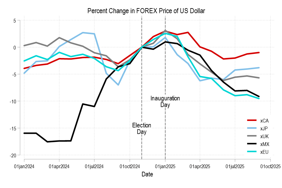 The more important effect of current policy comes from a topic on which I’ve published an article and subsequently refereed more than a dozen articles for others: Economic Policy Uncertainty (EPU) in the forex market. The results in the literature are intuitive: uncertainty increases exchange rate volatility, foreign-country EPU causes their currency to depreciate (fall in price) and the US currency to appreciate (rise in price), US uncertainty has historically been a mixed bag of results since the US dollar is a relatively safe investment in the long-run if not the short-run. People’s assets flock to the US in times of uncertainty. These results are contaminated by the fact that the US is a large economy and can spread uncertainty contagion to other countries. This happened most notably during the 2008 financial crisis.