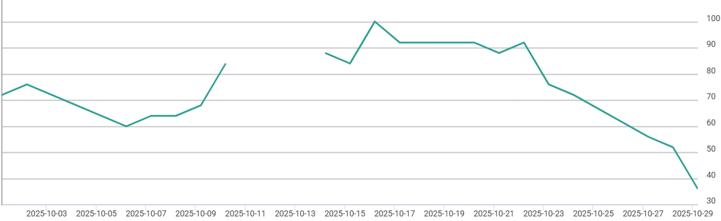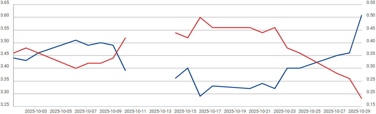 As of October 16, markets were 99.88% confident that interest rates would be cut by half a percent around Jerome Powell’s departure. Conveniently, however, we can track these expectations in real-time by watching how these numbers change each day. Let’s see how these expectations have changed throughout October. Below is the forward 6-month treasury rate implied by the October six and 12-month yields (left axis, Blue). Just as above, this forward rate implies a rate change relative to the average rate over the next six months – a rate cut (right axis, Red). With the most recent federal funds cut on the 29th, the market predicts less difference between rates over the next six months versus the following six months. The expected difference as of the 29th was only 18 basis points (0.0018%).