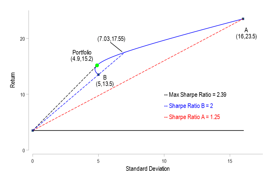 Consider a graph in (standard deviation, return) space. In this space we can plot the ordered pair for some portfolios. The risk-free return occurs on the vertical intercept where the return is positive and the standard deviation is zero. Say that a student was thrilled with asset A’s 23.5% return and that it’s standard deviation of returns was 16%. Meanwhile, another student was happy with asset B’s 13.5% return and 5% standard deviation. With a risk-free rate of 3.5%, the Sharpe ratios are 1.25 & 2 respectively. We can plot the set of standard deviation and return pairs that would share the same constant Sharpe ratio (dotted lines). Solving for the asset return: