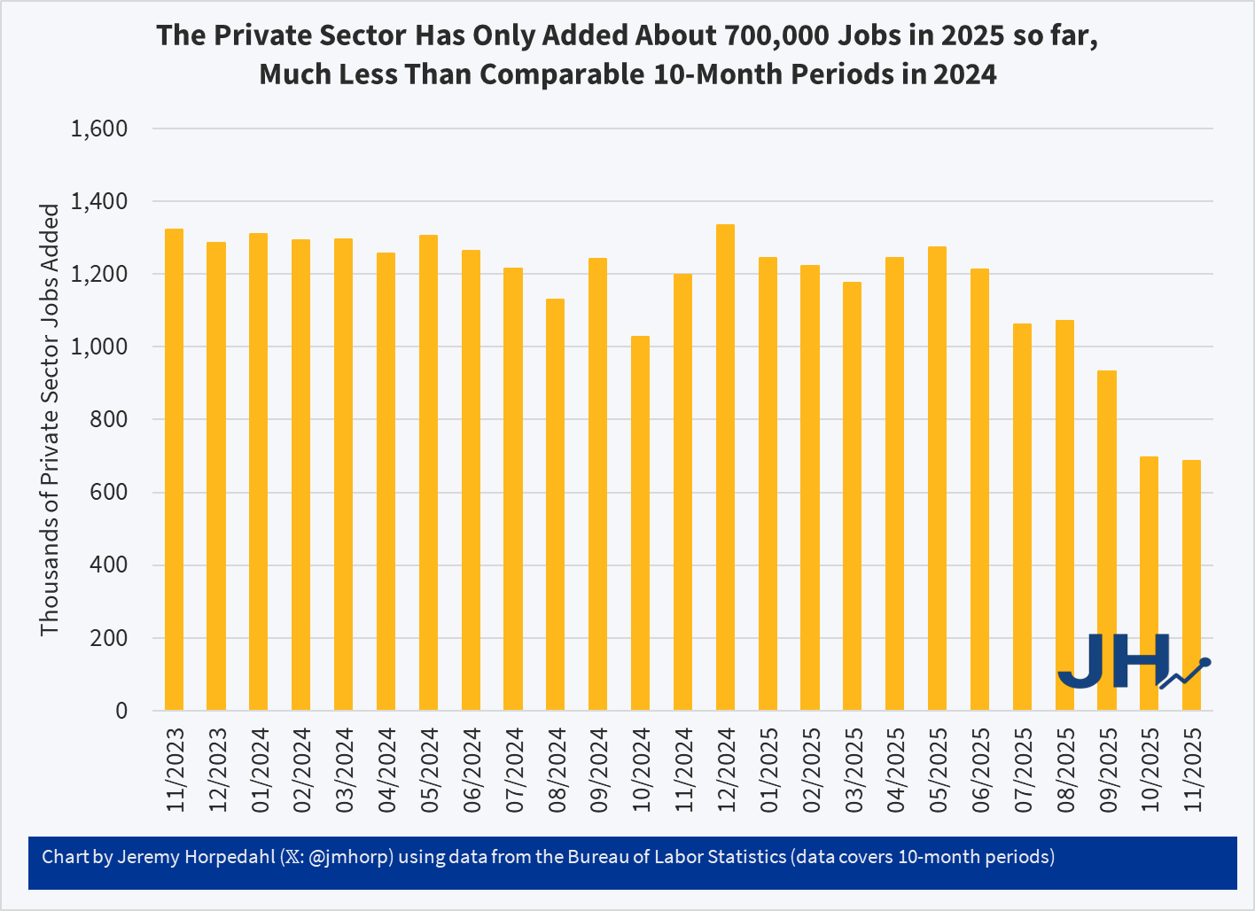 For example, from January to November 2025, there were 687,000 private-sector jobs added according to the CES, while total job growth (private and government) was 499,000 jobs. That much is true, assuming the data is correct. And BLS generally does a very good job calculating these, but keep in mind these are catch-up reports from a government shutdown, and it includes a month where you had one of the largest drops in federal employment in US history, due to the deferred resignation program. Keep in mind also that there was a very large downward revision to CES data last year, and there will probably be another big one in February 2026, so interpret any single month (or two) with extreme caution.