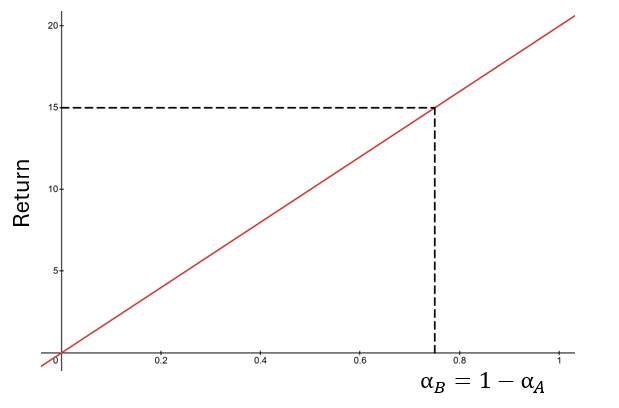 If we had invested 75% of our value in asset B and 25% in A, then we would have achieved the same return of 15%. In this two-asset case, it is clear to see that a return of 15% is better than the return earned by 75% of the possible portfolios. After all, possible weights are measures on the x-axis line, and the leftward 75% of that line would have earned lower returns. Another way of saying the same thing is: “Choosing randomly, there was only a 25% that we could have earned a return greater than 15%.”