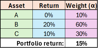 Say that I can choose to hold some combination of 3 assets (A, B, & C), each with unique returns of 0%, 20%, and 10%. Obviously, I can maximize my portfolio return by investing all of my value in asset B. But, of course, we rarely know our returns ex ante. So, we take a shot and create the portfolio reflected in the below table. Our ex post performance turns out to be a return of 15%.