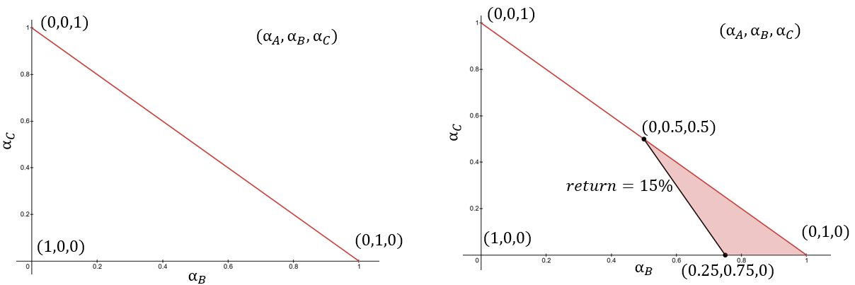 What about three assets? The portfolio weights of three assets require something more than just a line, but it’s still doable. See the image below-left. The x-axis measures the weight on asset B and the y-axis measures the weight on asset C. Where’s the weight on asset A? It’s whatever’s leftover. The three portfolios that are composed of only a single asset lie at the vertices. The black line below-left plots all of the asset weight combinations that would provide a return of 15%. The shaded region is the set of weights that yield a return that’s greater than 15%.