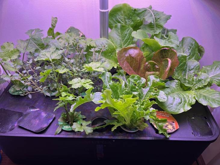 So I went with a MUGFA brand 18-hole hydroponics unit last winter. It is simple and robust. The LED growing lights are distributed along the underside of a wide top lamp piece. The lamp has a lot of vertical travel (14“), so you could accommodate relatively tall plants. The lights have a simple cycle of 16 hours on, 8 hours off. You can reset by turning the power off and on again; I do this once, early on some morning, so from then on the lights are on during the day and the evening, and off at night.  The water pump pumps the nutrient solution through channels on the underside of the deck, so each grow sponge has a little dribble of solution dribbling onto it when the pump cycle is on. I snagged a second MUGFA unit, a 12 hole model, when it was on sale last spring. The MUGFA units come complete with grow sponges/plugs, support baskets/baskets for the sponges, nutrients (that you add to the water), clear plastic domes you put over the deck holes while the seeds are germinating, and little support sticks for taller plants. You have to buy seeds separately.