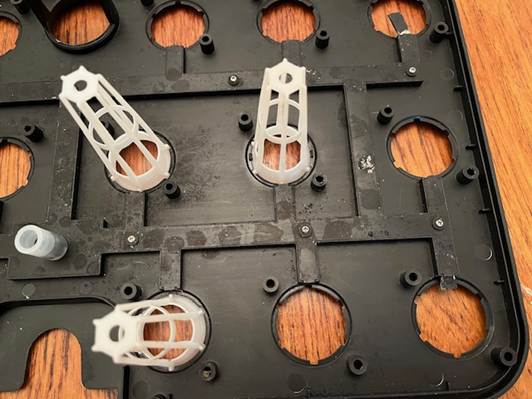 [1] For the hopelessly detail-obsessed technical nerds among us – – the specific design mistake in the 12-hole model is subtle. I’ll explain a little more here.        Here is a picture of the deck for the 18-hole model upside down, with three empty baskets inserted. The network of flow channels for the water circulation is visible on the underside. When the deck is in place on the tank, water is pumped into the short whitish tube at the left of this picture, flows into the channels, then out the ends of all the channels. (Note on the corner holes here, upper and lower right, I stuck little pieces of rubber into the ends of the flow channels to block them off since I don’t use the corner holes on this model; that blocking was not really necessary, it was just an engineering optimization by a technical nerd).