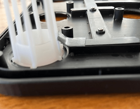 The 12-hole unit has a slightly more pleasing compact form factor, but it has a minor design defect [1]. The flow out of the outlet of each of the 12 channels under the deck is regular, but not very strong. Consequently, the water that comes out of each outlet drops almost straight down and splashes directly into the water tank, without contacting the grow sponge at that hole. The waterfall noise was annoying. The fix was easy, but a little tedious to implement. I cut little pieces of black strong duct tape and stuck them under the outlet of each hole, to make the water travel another quarter inch further horizontally. Those little tabs got the water in contact with the grow sponge basket. The picture below shows the deck upside down, showing the water channels under the deck going to each hole. There is a white sponge basket sticking through the nearest hole, and my custom piece of black duct tape is on the end of the water channel there, touching the basket. (In order to cover the exposed sticky side of the duct tape tab that would be left exposed and touching the basket, I cut another, smaller piece of duct tape to cover that portion of the tab, sticky side to sticky side.). This sounds complicated, but it is straightforward if you ever do it. Also, many cheap knock-off hydroponics units don’t have these under-deck flow channels at all. With MUGFA you are getting nearly Aerogarden type hardware for a third the price, so it is worth a bit of duct tape to bring it up to optimal performance.