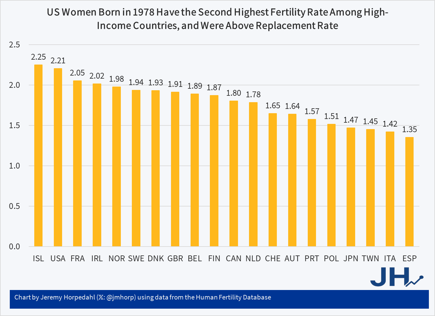 For women born in 1978, only tiny Iceland is higher than the US, and not by much. Countries like Spain, Italy, Taiwan, and Japan were already at very low fertility rates for the most recent generation to age out of child-bearing years. You have to go back to the 1974 birth year of women to get a much larger group of countries (28), but even then, the US and Iceland are clearly leading the pack. No other country is close among those in the HFD.