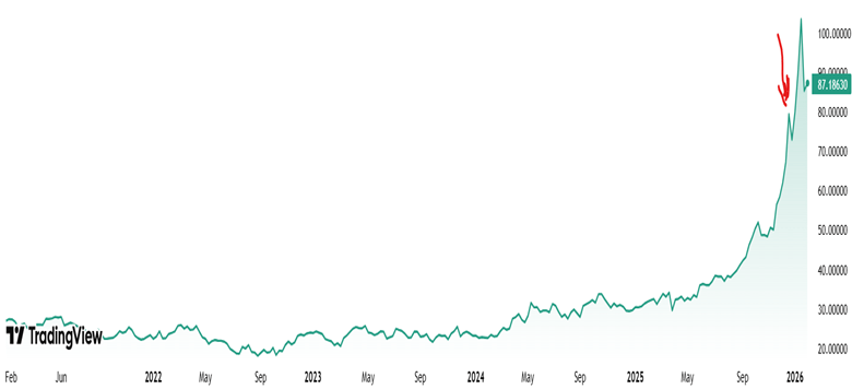 • Aggressive profit-taking after silver surged over 40% year-to-date and hit record highs near $121 per ounce.