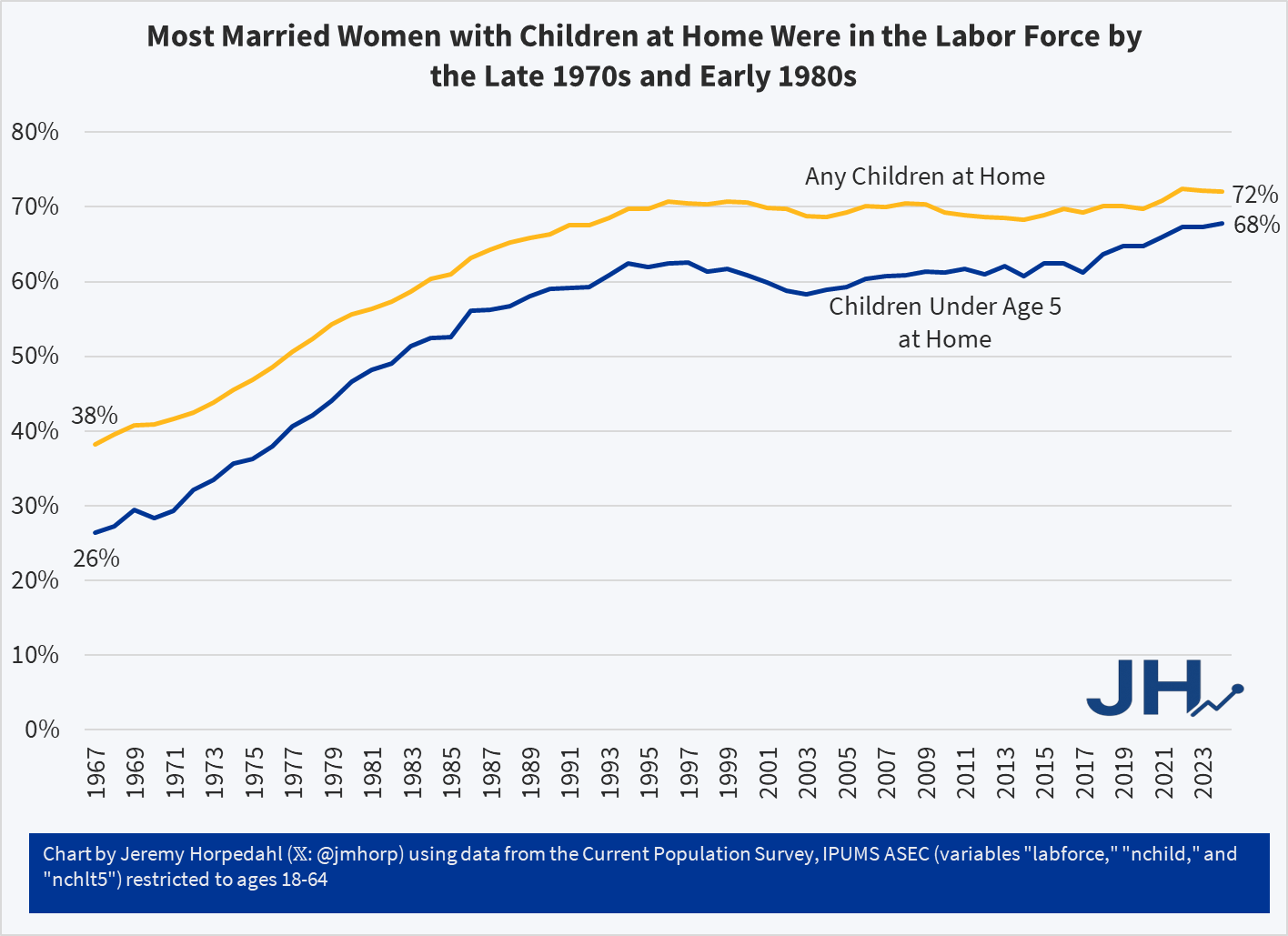 By 1977 over half of married women with children at home were in the paid labor force. If we restrict the analysis to women with children under age 5 (before they would be in school), it takes a few more years to get to 50 percent, but this happens by 1983. So for the years mentioned in the Tucker essay, 1976 and 1984, he almost perfectly hits the years when a majority of married mothers were already in the labor force. If the comparison were to, say, median income in 1967, the analysis performed by Tucker might make sense. Back then, well under half of married women with children were working.