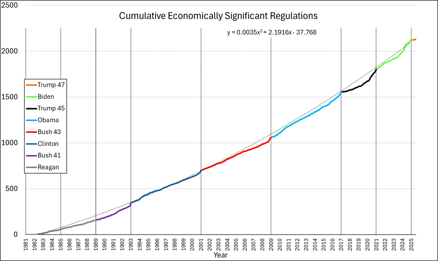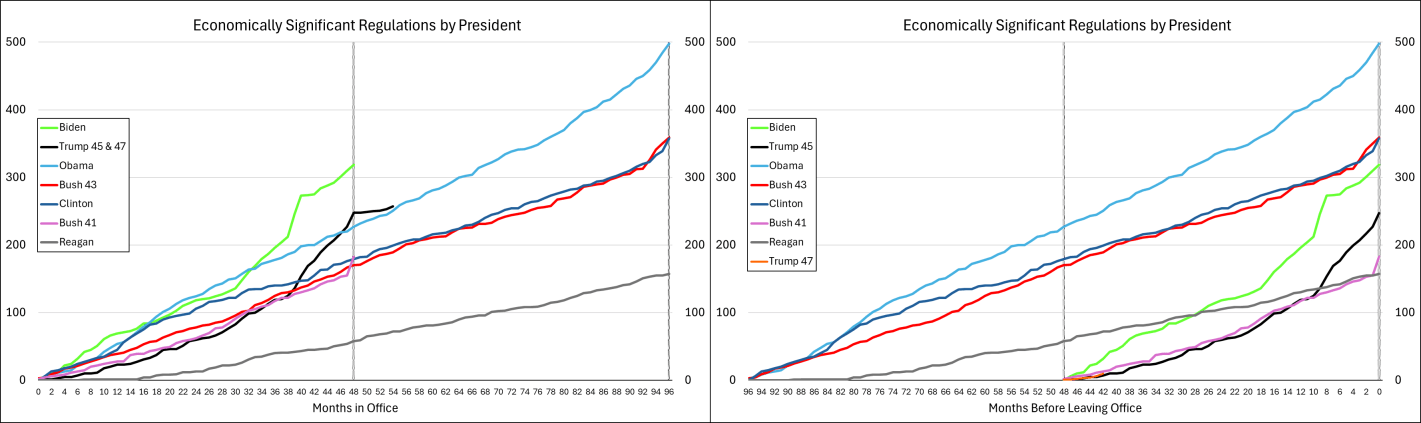 The graph below-left shows the number of economically significant regulations for each president since the start of his term, through July of 2025. It’s reproduced from the link above except that I appended Trump’s second term onto his first term. What does the graph tell us? There doesn’t seem to be much of a difference between republicans and democrats. Rather, it seems that, generally, the number of economically significant regulations increases over time. Importantly, the below lines are cumulative by president. So each year’s regulations each cost $100m annually and that’s on top of the existing ones already in place. So, regulatory costs generally rise, with the caveat that we don’t see the relief provided by small or rescinded regulations (for that matter, we don’t see small regulatory burdens here either). Something else that the below graph tells us is that presidents tend to accelerate their economically significant regulations prior to leaving office. Reagan was the only exception to this pattern and he *slowed* the number of regulations as the end of his term approached.