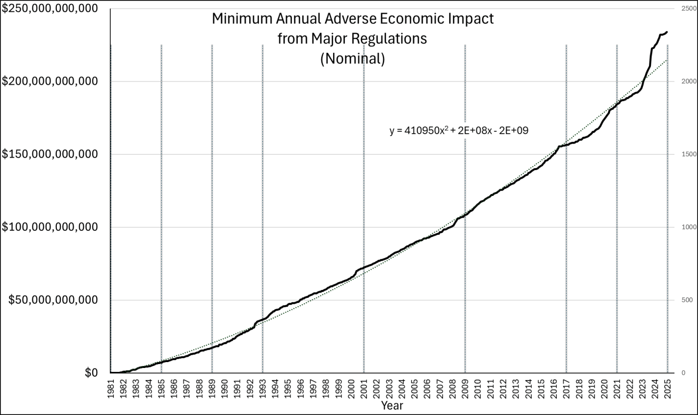 The same change means that, in nominal terms, the Biden acceleration of the economic burden is overestimated relative to other presidents. It’s possible that the impact of regulations has not risen over time and instead that the real threshold has fallen. Regardless, the rough estimated annual impact of economically significant regulations was $234 billion by July of 2025. Since the GDP in 2025 was 30.8 trillion, we can estimate, again as a minimum, that economically significant regulations cost the US at least 0.7% of GDP. If that number sounds small and unimportant, recall that it’s a minimum and that the actual cost is probably much higher. In terms of fit, the pattern is still approximated by a quadratic function, though a power function performs similarly.