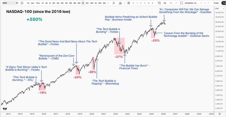 Investors have been hearing “tech bubble” warnings for more than a decade — but instead of collapsing, the Nasdaq‑100 has gained 550%. If we look back ten years ago to 2015, headlines such as “Sell everything! 2016 will be a cataclysmic year” confronted investors with calls for an imminent recession. The bears made repeated claims that a “tech bubble” was about to burst with some of the world’s most prominent venture capitalists drawing parallels to the dot-com era.
