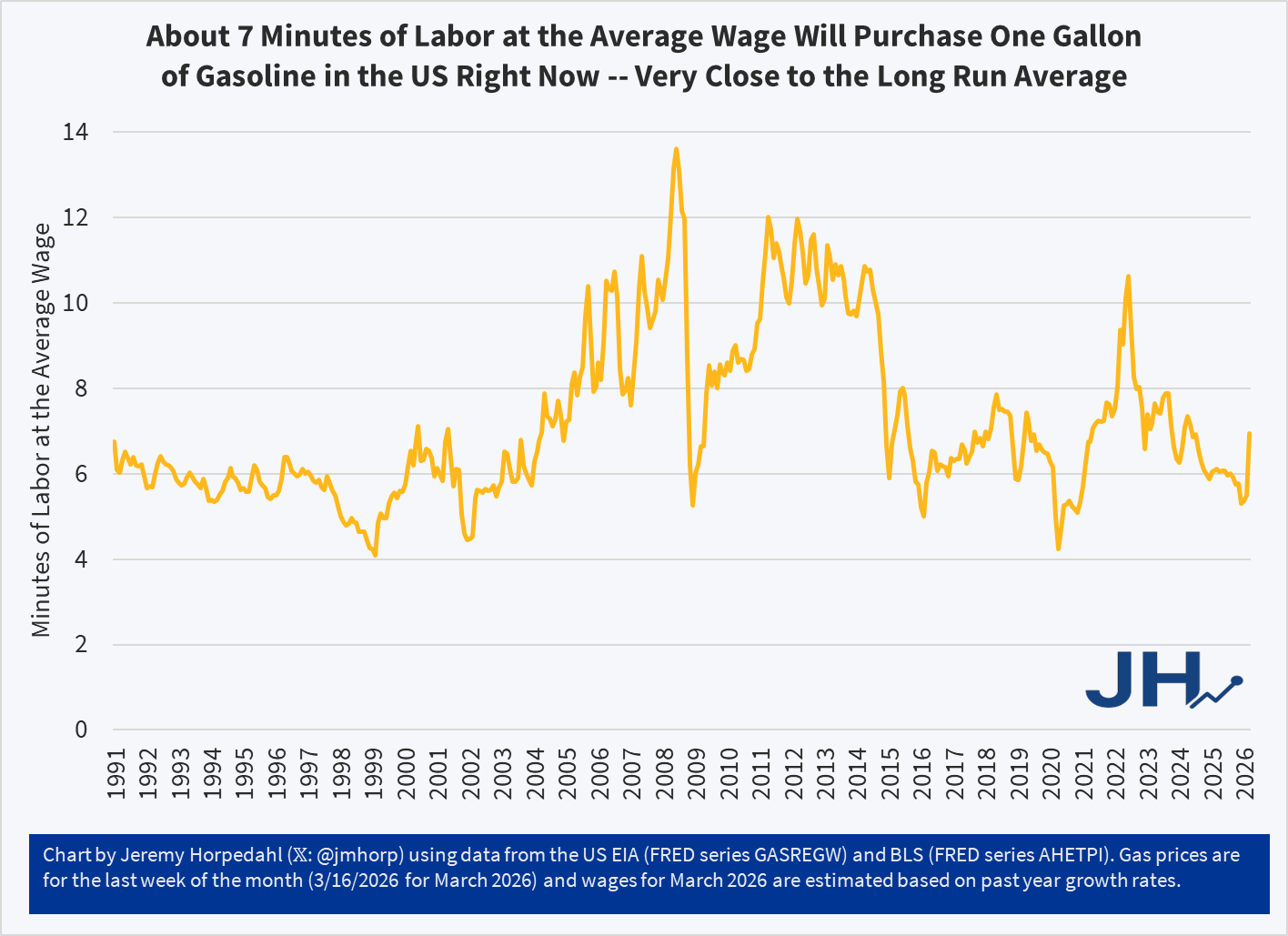 Despite this sharp increase, gasoline prices remain near the long-run average in terms of affordability: it takes about 7 minutes of work at the average wage to purchase a gallon of gasoline. To be sure, this is a big jump of where it had been earlier in 2026, at about 5 minutes of labor. Nonetheless, gasoline is still (for now!) more affordable than it was, relative to wages, for almost all of 2022 and 2023.