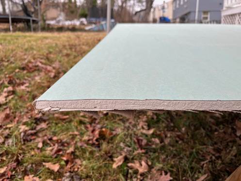 First, how to you cut drywall? A long, straight cut is accomplished by drawing a straight line and cutting along it, all the way through one layer of the facing paper. Then you hang the drywall sheet on the edge of a table, and crack the interior gypsum layer. Then you cut the other side of the paper. The end result of such a cut is like this: