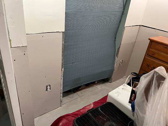 The next two photos are before and after of a bedroom wall, again showing the bottom course of sheetrock we installed.