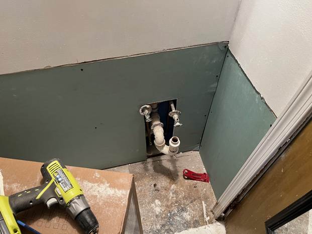 This was in a bathroom. I cut the lower green pieces with a little hand power saw, and screwed them into the studs, using the green and black driver visible on the stand in the left foreground.