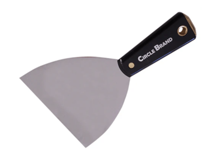 As you can see, at this stage, there are like ¼” cracks between the installed sheets of sheetrock, and the mounting screw holes are visible. These imperfections are filled in with goo called joint compound, or “mud.” The mud is applied with a “knife” like this: