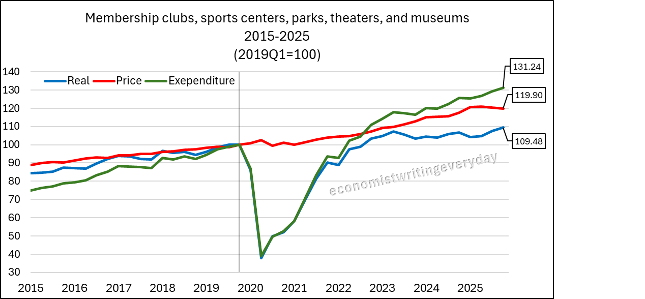 In the several years prior to Covid, “Recreational Service” industry sales had been chugging along, growing at healthy annual rate of 3.4% (inflation adjusted). This category of services includes clubs, sports centers, theaters, and museums. In the blink of an eye, the covid shock drastically reduced spending in that category by more than 60%. See the graph below.