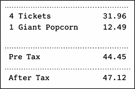 I owed my oldest children a date and I wanted something that wasn’t simply getting an ice cream and would be something memorable for them (remember that people don’t go to the movies anymore!). They can’t remember ever going to a movie theater. Below is my total spend with a 6% tax rate. Before kids, I would *never* have purchased popcorn at seemingly extortionary prices. After all, a half cup of kernels fills a mixing bowl and costs a few cents. But this was a date, after all.