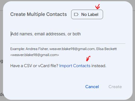 ( 4 ) Go to Gmail or Google, and click on the nine-dots icon at the upper right, and select Contacts. At the upper left of the Contacts page, click Create Contact. You’ll have choice between Create a Contact (for single contact), or Create multiple contacts. Click on the latter.