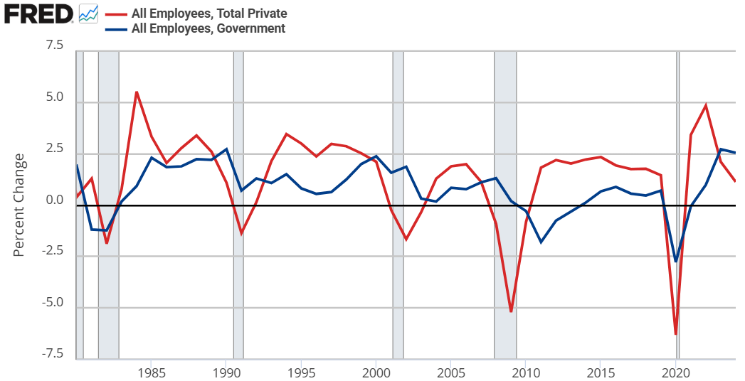Hayek starts by assuming that government jobs are stable relative to those in the private sector. This might seem obvious, but let’s just start by checking the premises. Below are the percent change in total compensation and total employment for government employees and for the private sector. From year to year, private employment and total compensation is more volatile. So, Hayek’s initial premise is correct.