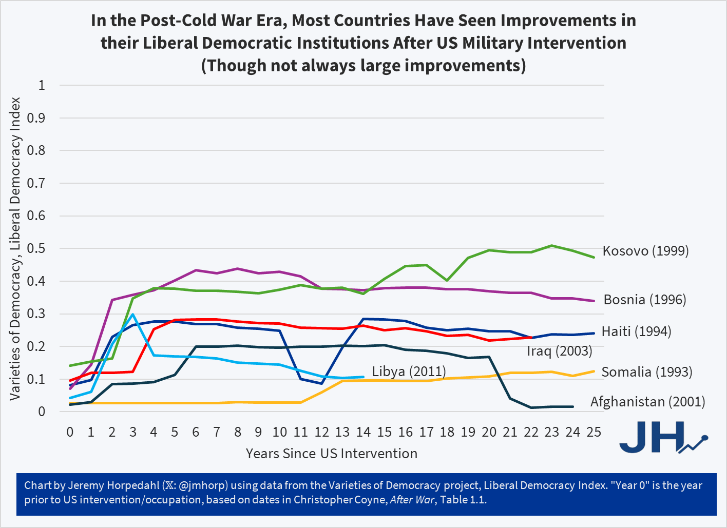 The first thing you might notice is that relevant to their starting position (pre-US military intervention), all except one of these countries saw improvements in their V-Dem Liberal Democracy Score after 25 years (or whatever the end point is for those more recent than 25 years). Some of the improvements — such as Libya, Somalia, and Iraq — are quite small, around 0.1 points on the 1-point scale. But other improvements — especially Kosovo and Bosnia — are quite large, around 0.3 points on the 1-point scale.