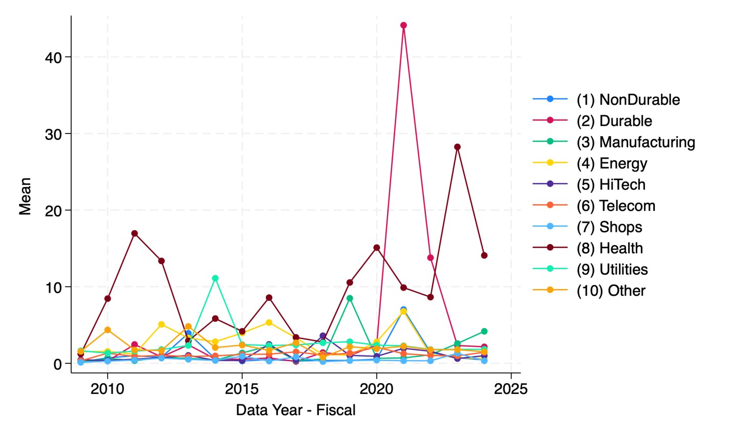 Source: My graph made from Compustat North American Fundamentals Annual data collapsed by Standard Industrial Classification code into the Fama-French 10 sectors