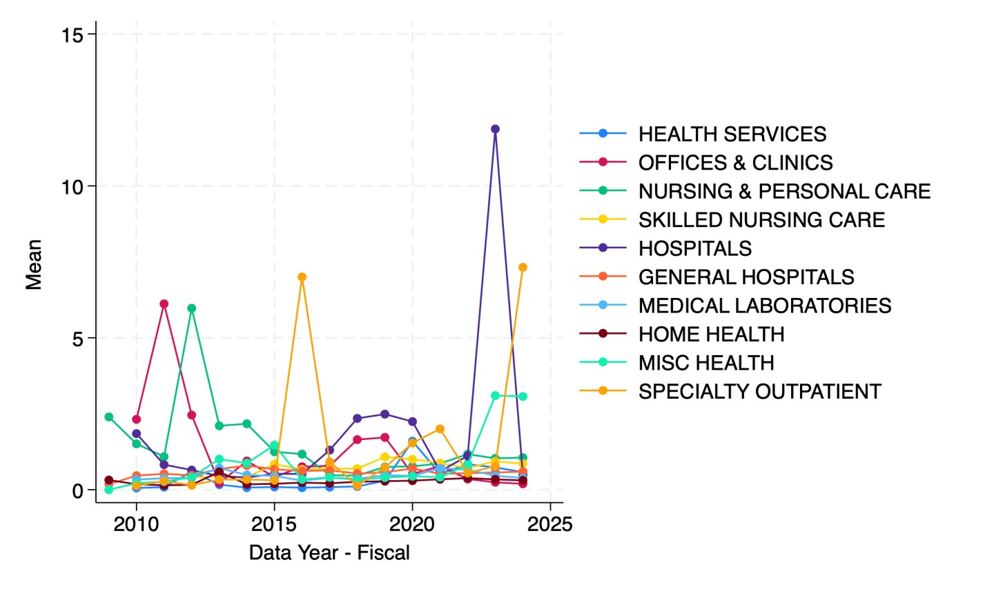 Hospitals in 2023 followed by specialty outpatient in 2024. However, seeing how much the numbers bounce around from year to year, I suspect they are driven by small numbers of outlier firms. This could be because Compustat North America data only covers publicly traded firms, but many sectors of health care are dominated by private corporations or non-profits.