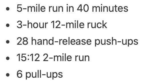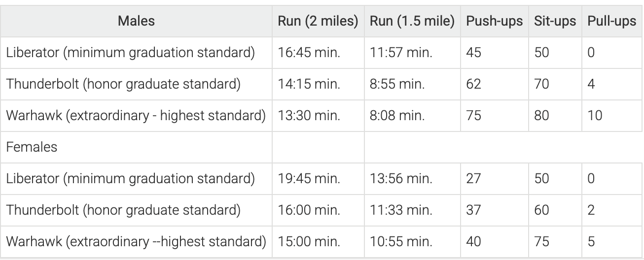 I like that the standards all involve a mix of strength and speed, and that they might take some work but should be achievable in a reasonable amount of time for a healthy person. I also like that they give stretch goals for the over-achievers in addition to their minimums.