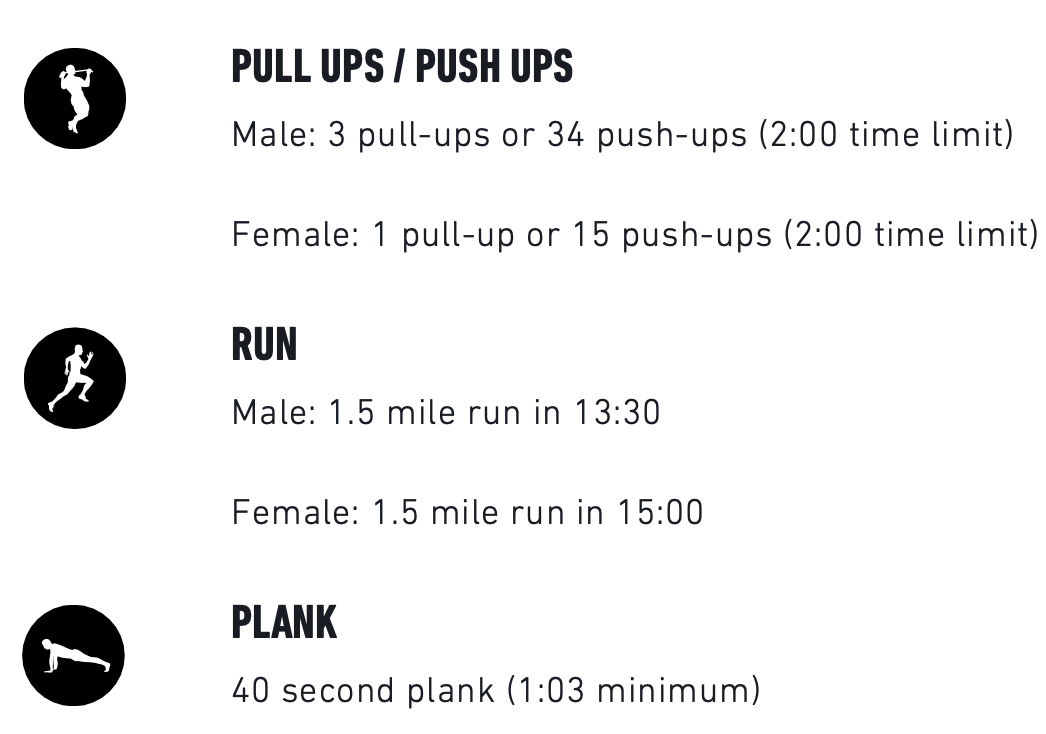 The Army has a complex points system that varies by age and gender, but their minimum standards for a 20-year-old Male include: hex bar deadlift 150 lbs for 3 reps, 15 hand-release pushups within 2 minutes, plank for a minute 30, and a 2 mile run in 19:57 (plus their own sprint/drag/carry test in 2:28).