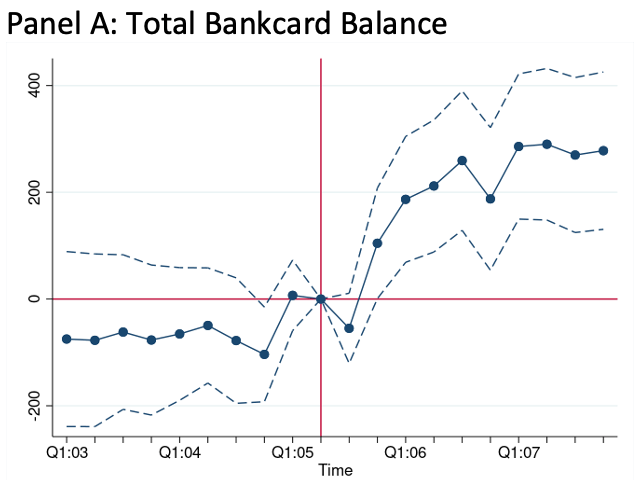 In short, we find that after Medicaid is cut, people do more out-of-pocket spending on health care, leading to increases in both credit card borrowing and debt in third-party collections. Our back-of-the-envelope calculations suggest that debt in collections increased by $494 per Medicaid-eligible Missourian, which is actually smaller than has been estimated for the Tennessee cut, and smaller than most estimates of the debt reduction following Medicaid expansions.