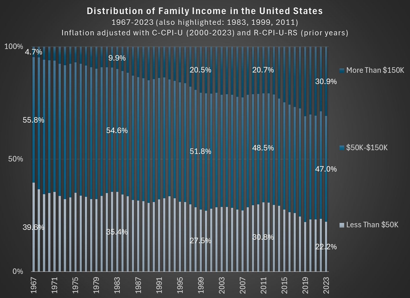 In 1967, about 56 percent of families in the US had incomes between $50,000 and $150,000, stated in 2023 inflation-adjusted dollars. In 2023, that number was down to 47 percent. So the American middle class shrunk, but why? (Note: you can do this analysis with different income thresholds for middle class, but the trends don’t change much.)