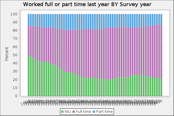 Is this increase in family income caused by the rise of two-income households? To some extent, yes. Women have been gradually shifting their working hours from home production to market work, which will increase measured family income. However, this can’t fully explain the changes. For example, the female employment-population ratio peaked around 1999, then dropped, and now is back to about 1999 levels. Similarly, the proportion of women ages 25-54 working full-time was about 64 percent in 1999, almost exactly the same as 2023 (this chart uses the CPS ASEC, and the years are 1963-2023).