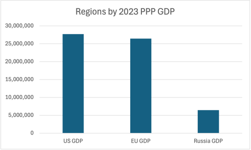 Europe may be significantly poorer than the US on a per-capita basis, but it has significantly more people, so the total size of their economy is almost as large as the US and over 4 times larger than Russia: